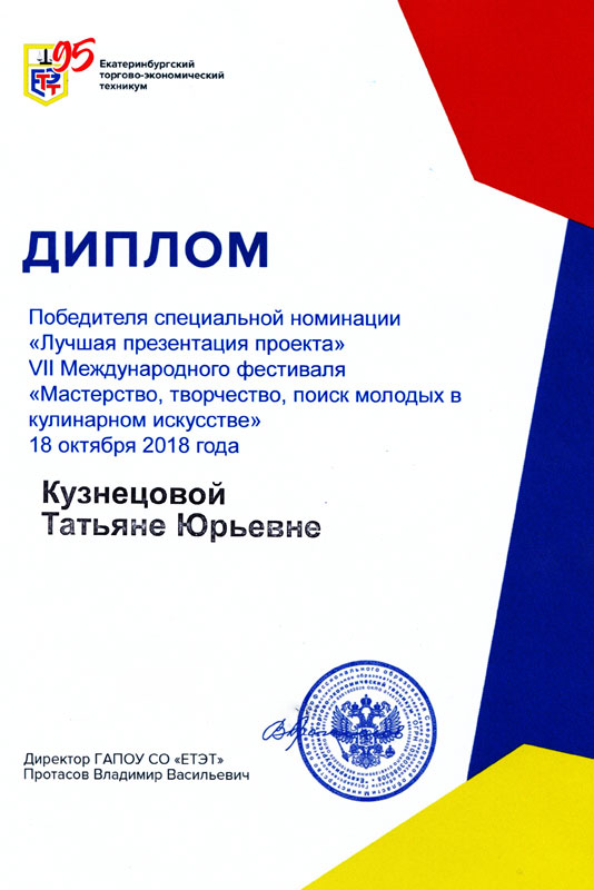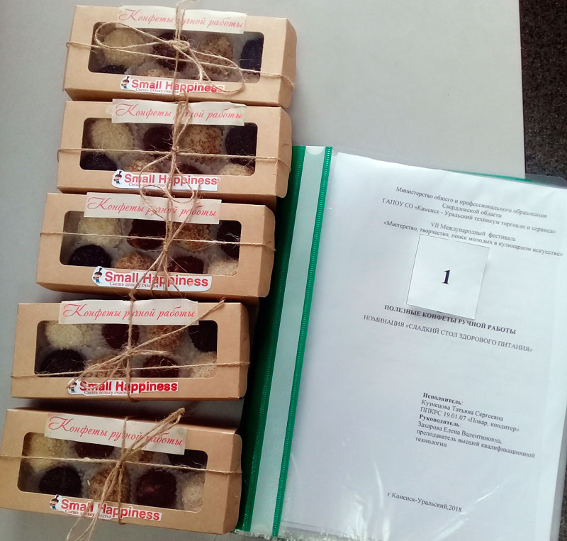 Татьяна блестяще защитила проект «Здоровое питание нации». В номинированной презентации Татьяны есть исследовательский опрос целевой аудитории, технологическая карта, данные мониторинга НИИ питания, сравнительный анализ пищевой ценности фабричных сладостей и полезных конфет ручной работы. Также Татьяна представила видео мастер-классов и дегустации в среде потенциальной целевой аудитории. Кроме того, Татьяна является постоянным помощником в мастер-классах проводимых ее научным руководителем Захаровой Е.В. по изготовлению полезных конфет.