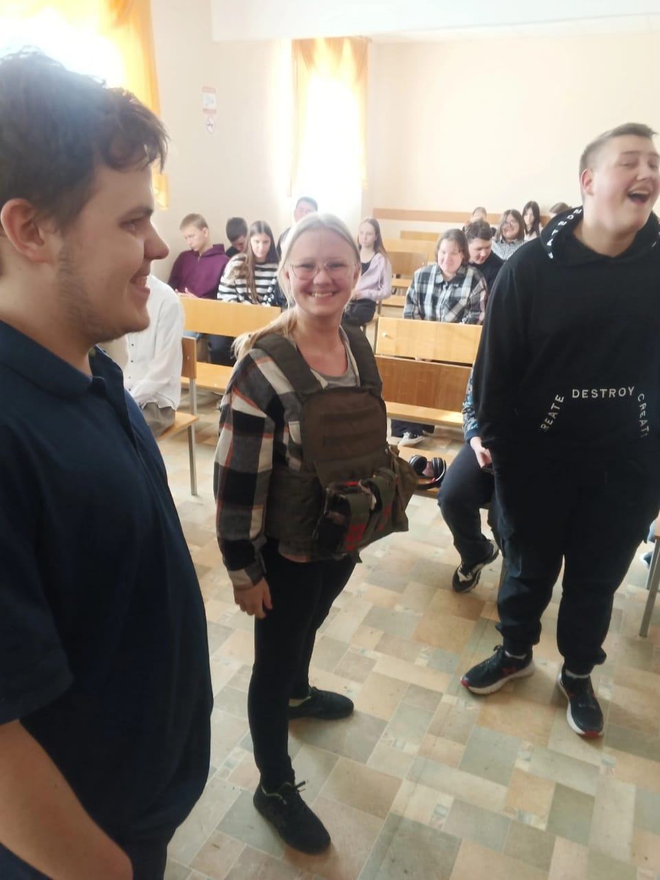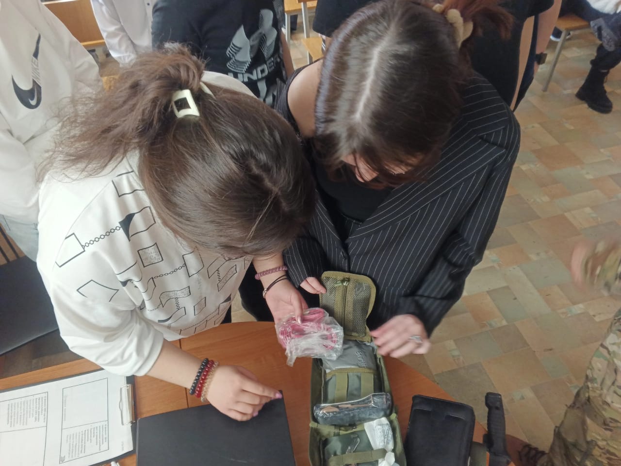 Студенты с интересом задавали вопросы о технике, быте и моральном духе солдат. А когда Константин Михайлович продемонстрировал обмундирование, многие из ребят смогли примерить его на себя, почувствовав себя частью чего-то большего — части команды защитников Родины.