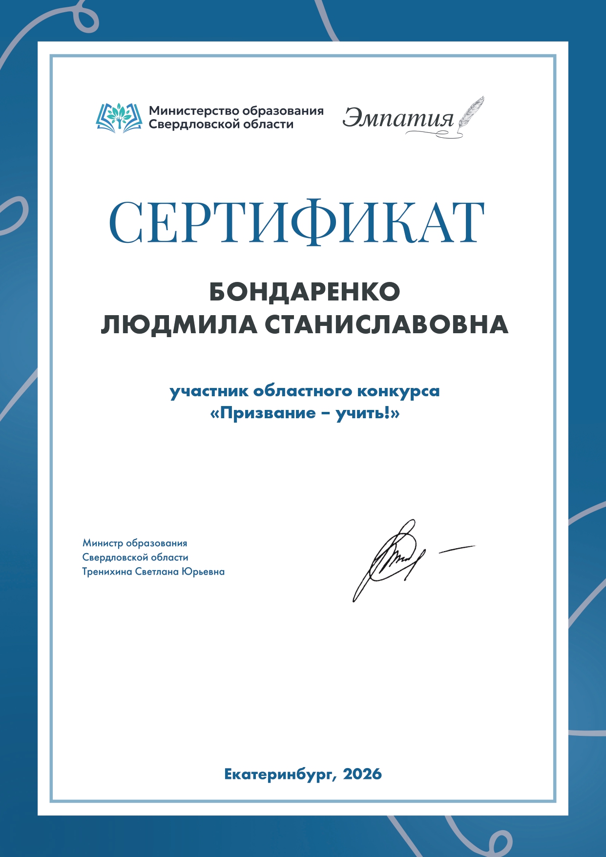 Участие в профессиональных конкурсах — это важный этап в развитии любого преподавателя, возможность выйти за рамки привычной аудитории и получить независимую оценку своего труда. В 2025/2026 учебном году свои силы в областном конкурсе «Призвание – учить!» попробовала Людмила Станиславовна Бондаренко, преподаватель иностранного языка Каменск-Уральского техникума торговли и сервиса.