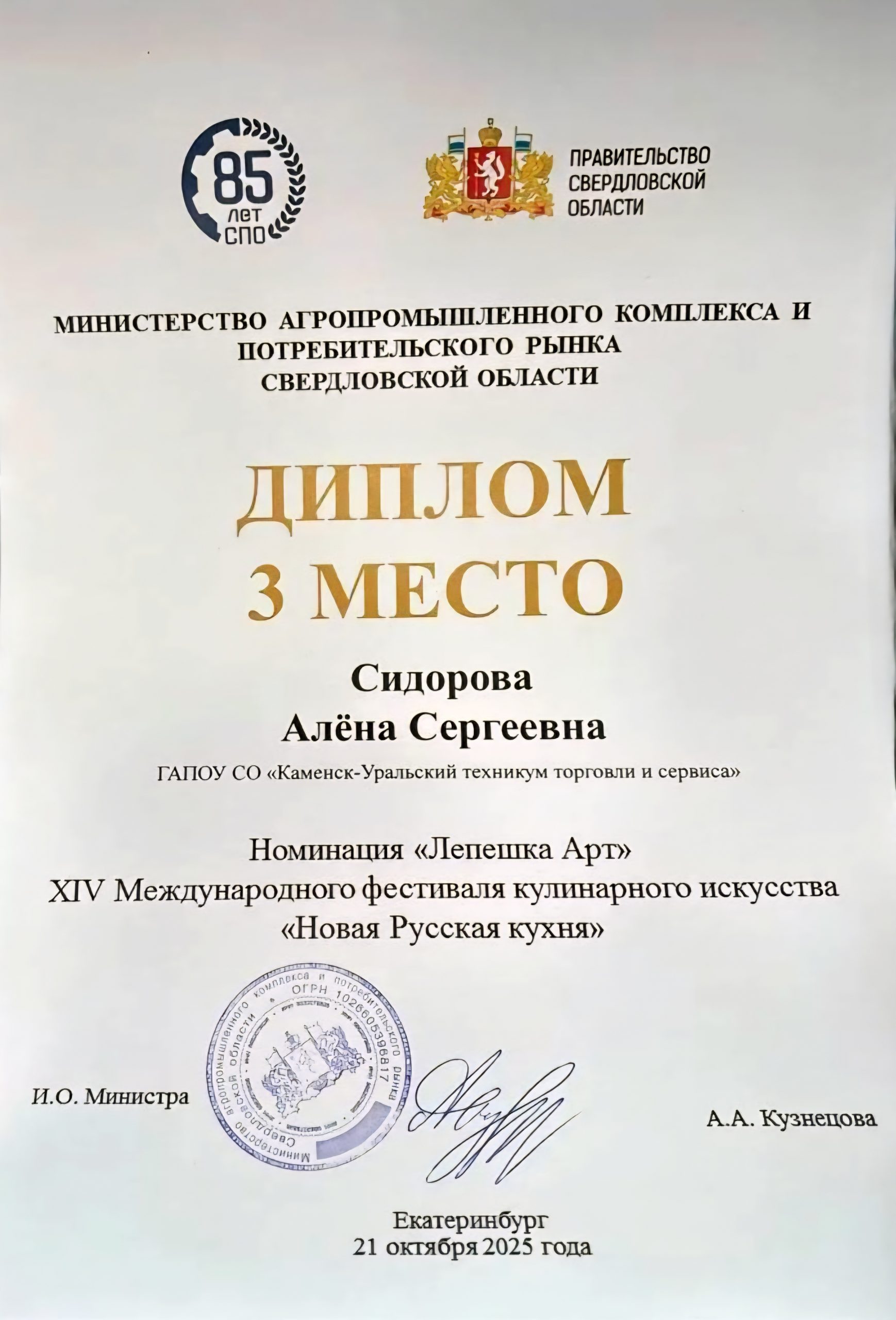 Сегодняшний день войдет в историю техникума яркой кулинарной победой! Мы безмерно гордимся и поздравляем талантливую студентку Сидорову Алёну из группы ПКД-204/24 с почетным 3 местом на XIV Международном фестивале кулинарного искусства «Новая Русская кухня»!