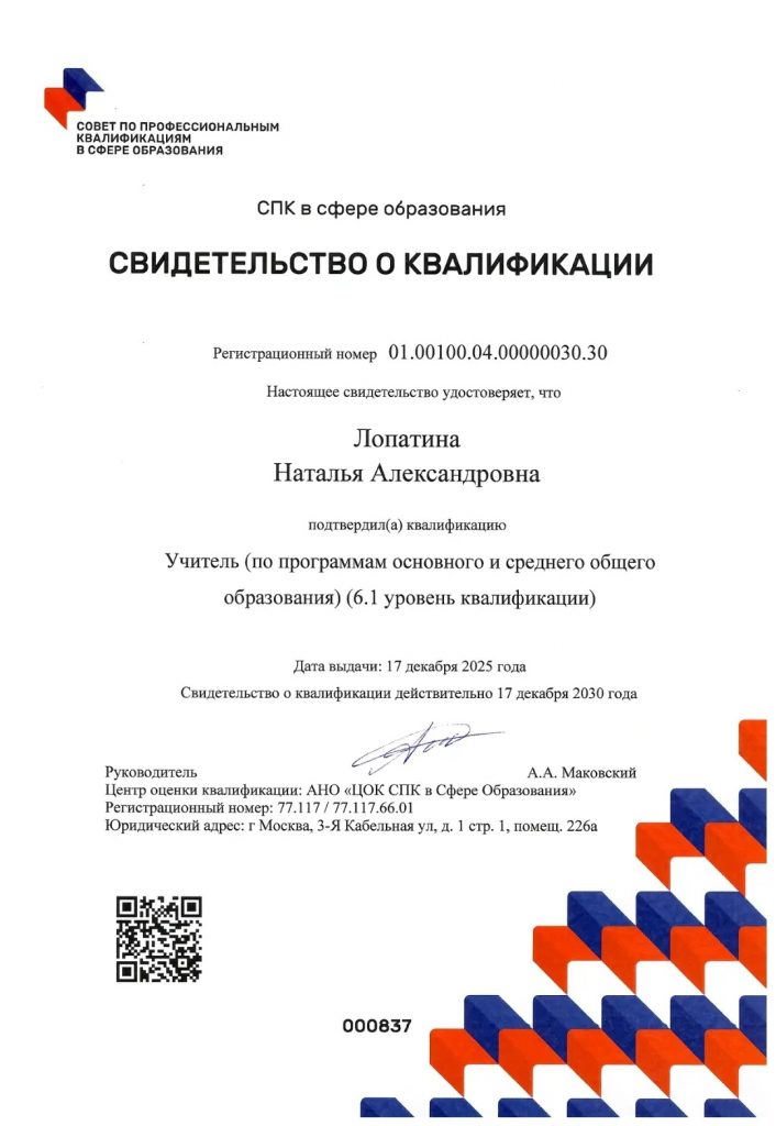 ЛОПАТИНА Наталья Александровна и БЫЧКОВА Дарья Валерьевна 19 ноября 2025 г. прошли квалификационные испытания по должности «УЧИТЕЛЬ» (по программам основного и среднего общего образования – уровень квалификации 6.1).