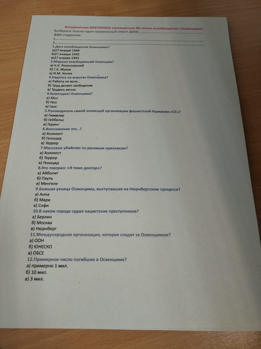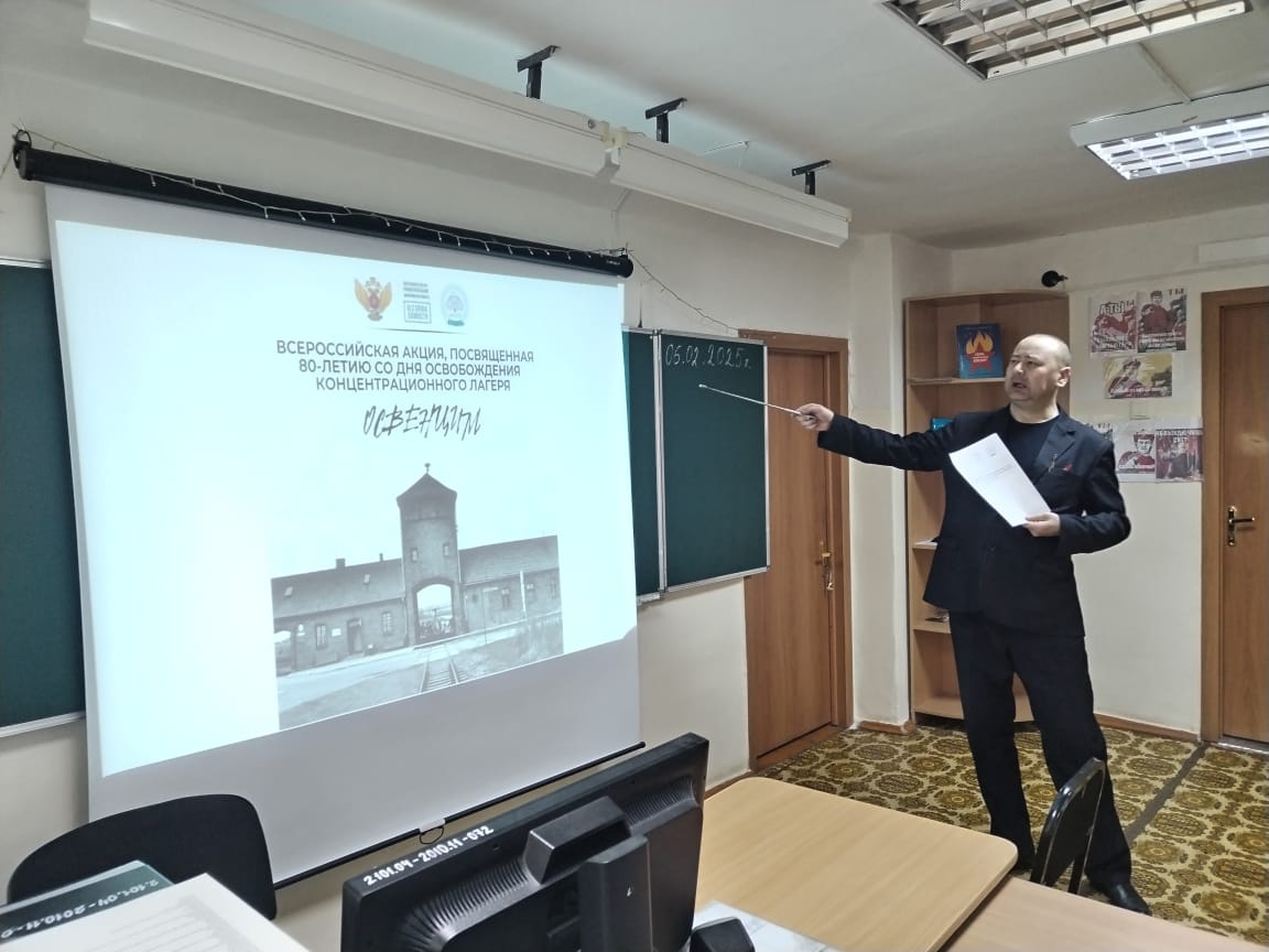 В рамках Всероссийской акции, посвященной 80-летию освобождения концентрационного лагеря Освенцим, преподаватели истории Щепелин Иван Владимирович и Помазкина Галина Дмитриевна провели уроки памяти для студентов.