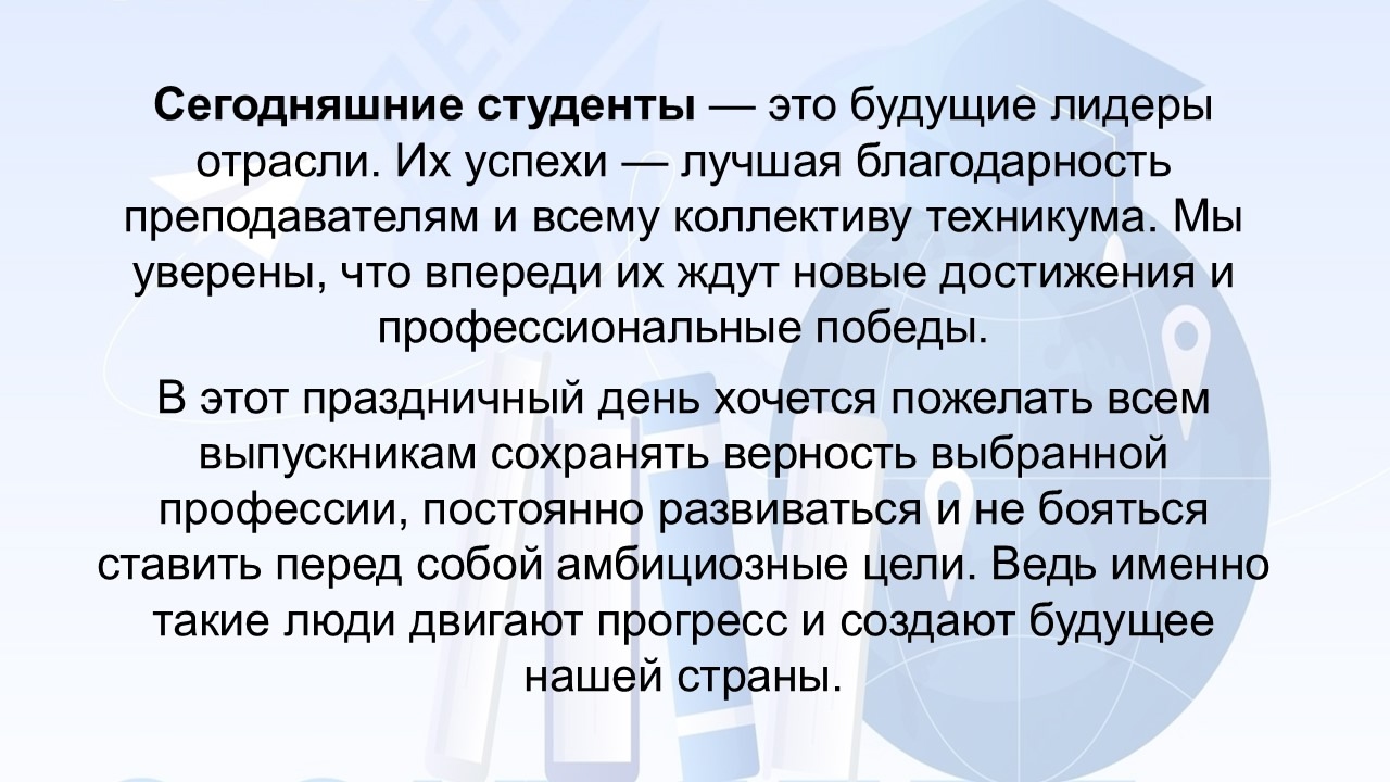Наши талантливые студенты – это наша гордость и надежда! Вы – будущее нашей страны, и мы верим в ваш потенциал и способности. Желаем вам неиссякаемого стремления к знаниям, творческих успехов, новых достижений и ярких побед на профессиональном пути!