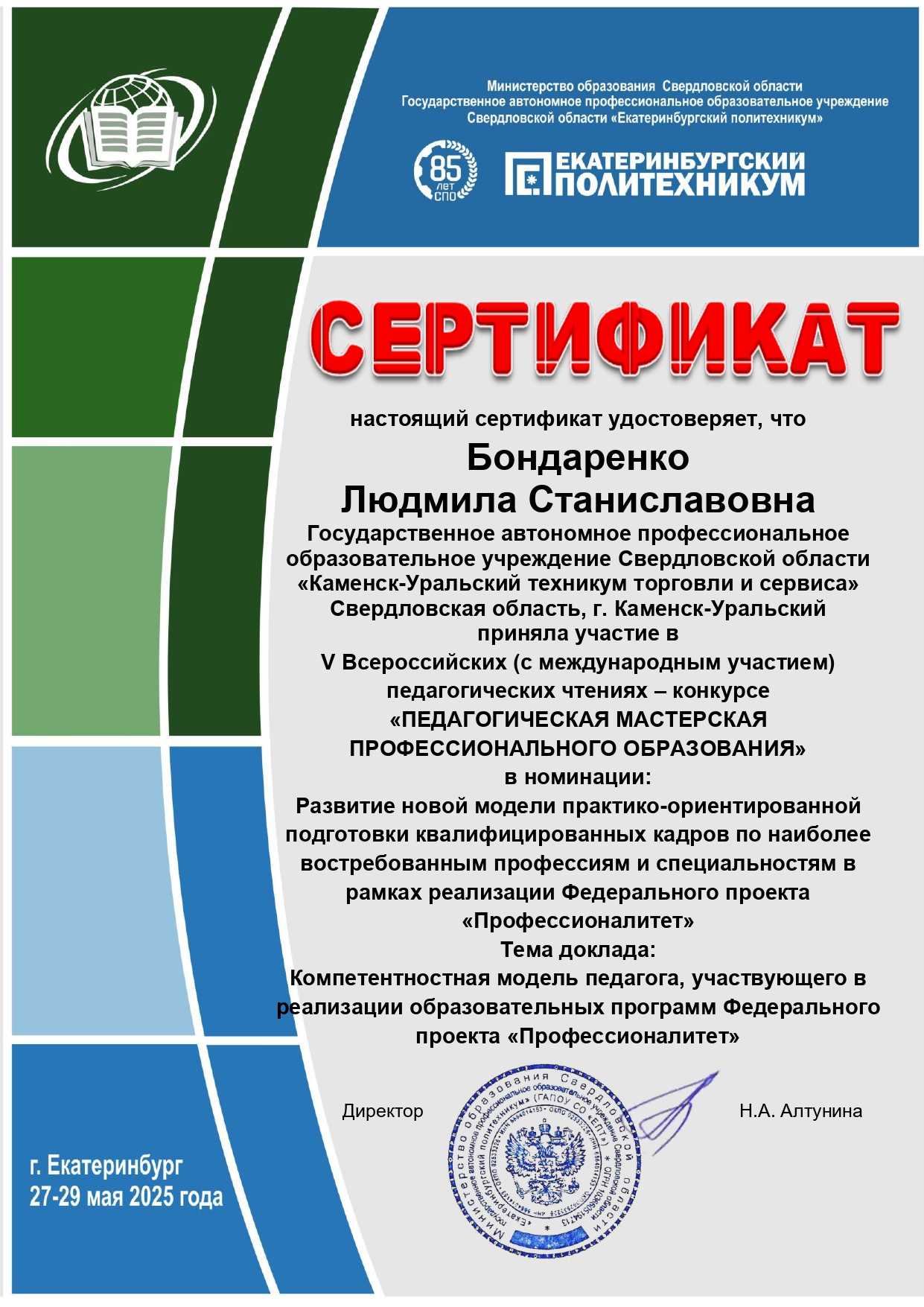 Бондаренко Людмила Станиславовна (Секция № 1: Развитие новой модели практико-ориентированной подготовки) представила исследование на тему «Компетентностная модель педагога, участвующего в реализации образовательных программ Федерального проекта «Профессионалитет»». Людмила Станиславовна набрала 45,86 баллов, внеся значимый вклад в обсуждение ключевых качеств современного преподавателя в рамках нового проекта.