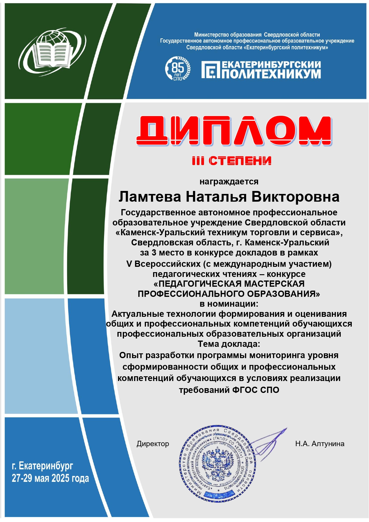 Ламтева Наталья Викторовна (Секция № 3: Актуальные технологии формирования и оценивания общих и профессиональных компетенций) выступила с докладом «Опыт разработки программы мониторинга уровня сформированности общих и профессиональных компетенций обучающихся в условиях реализации требований ФГОС СПО». Наталья Викторовна набрала высокий итоговый балл – 51,92 и заняла 3 место в своей секции. Ее работа посвящена созданию эффективного инструментария для объективной оценки результатов обучения.