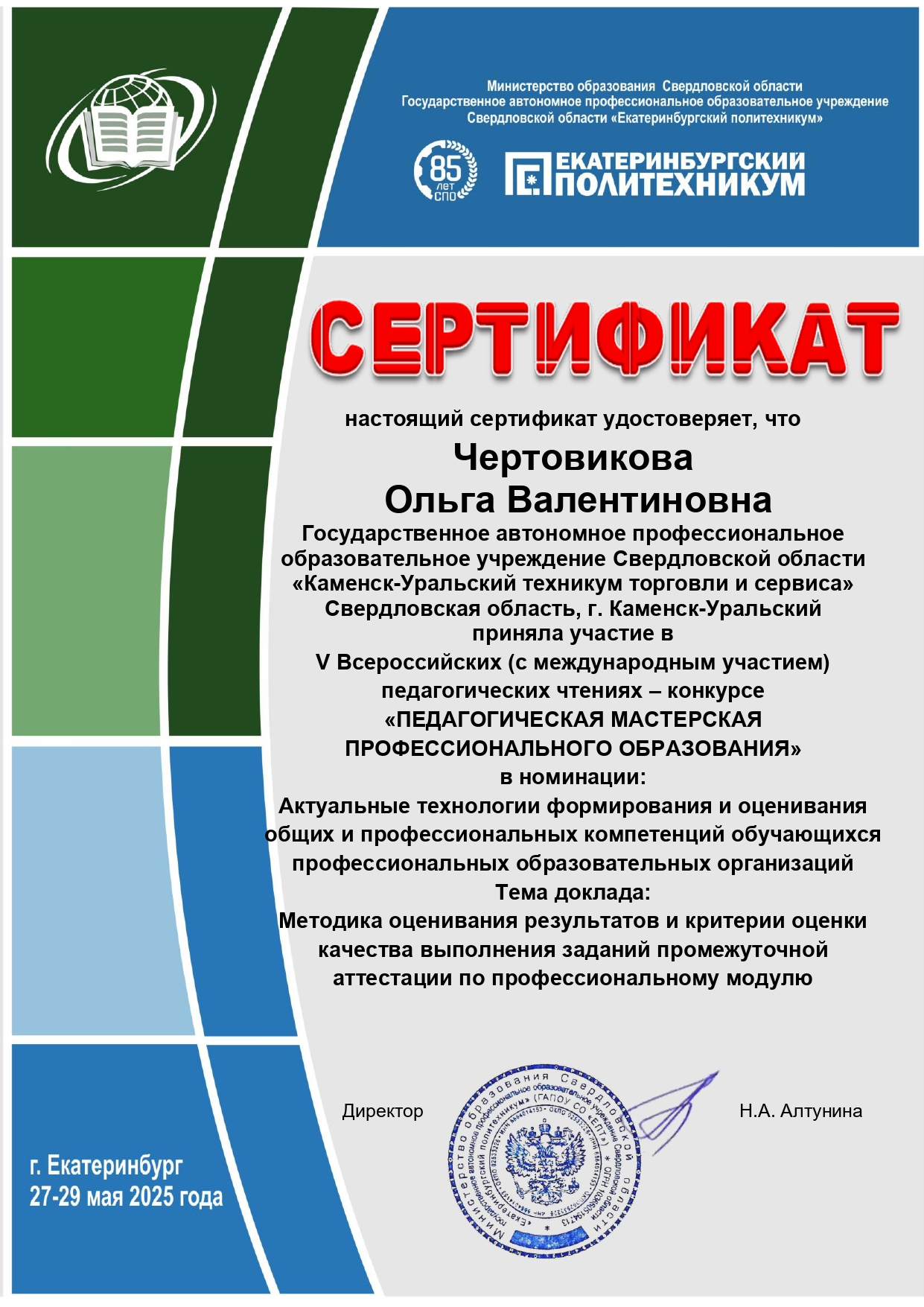 Чертовикова Ольга Валентиновна (Секция № 3: Актуальные технологии формирования и оценивания общих и профессиональных компетенций) поделилась наработками в докладе «Методика оценивания результатов и критерии оценки качества выполнения заданий промежуточной аттестации по профессиональному модулю», набрав 45,81 балла. Ее работа предлагает конкретные решения для повышения объективности и прозрачности оценивания профессиональных навыков студентов.