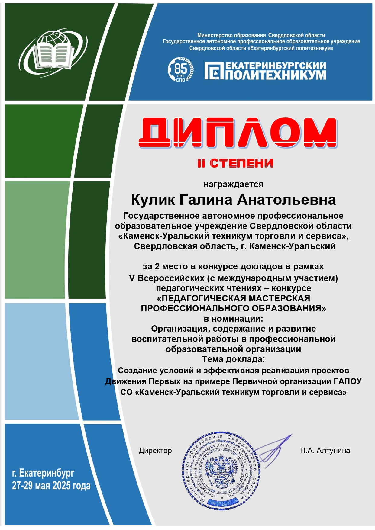 Кулик Галина Анатольевна и Казанцева Наталья Васильевна (Секция № 4: Организация, содержание и развитие воспитательной работы) совместно подготовили доклад «Создание условий и эффективная реализация проектов Движения Первых на примере Первичной организации ГАПОУ СО «Каменск-Уральский техникум торговли и сервиса»». Их практический опыт организации воспитательной работы через современное молодежное движение был высоко оценен экспертами – авторы набрали 54,93 балла и завоевали 2 место в своей секции.