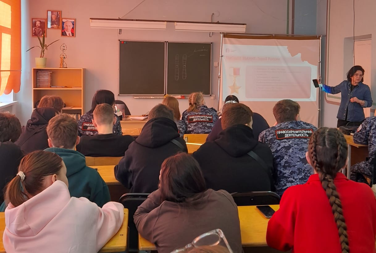 Наталья Анатольевна познакомила студентов с героическими страницами истории нашей страны, рассказала о подвигах Героев России, о тех, кто своими героическими поступками доказывает преданность Отчизне.