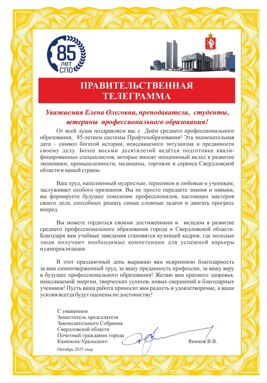 Правительственная телеграмма с поздравлениями с 85-летием СПО и Днем среднего профессионального образования — это большая честь для нас! Будем и дальше работать на благо развития образования!